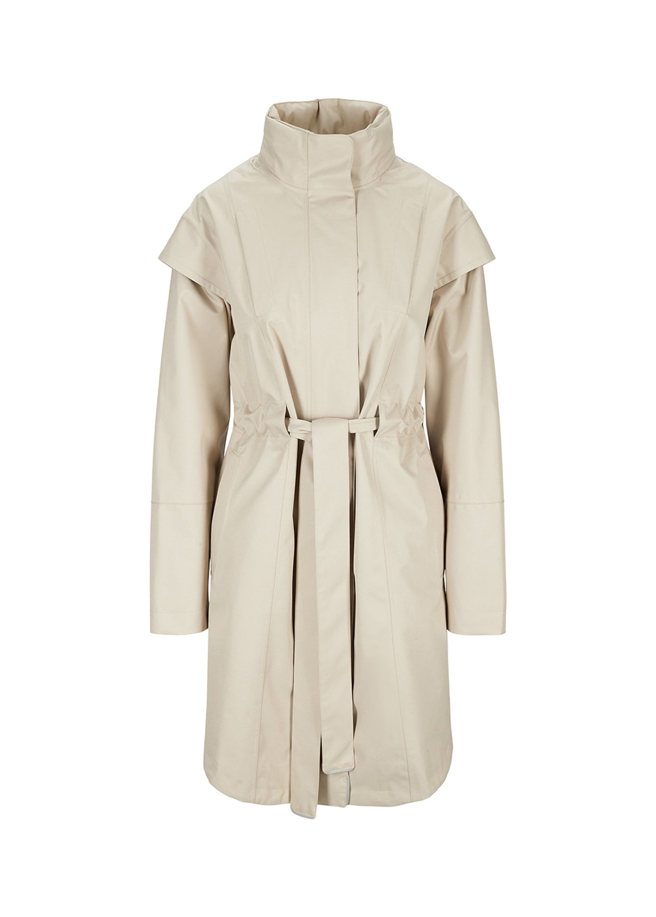 Monsun i fargen Sand, er en vanntett regnjakke med fine detaljer som cap sleeves, belte i tunnel og skjult hette i kragen.