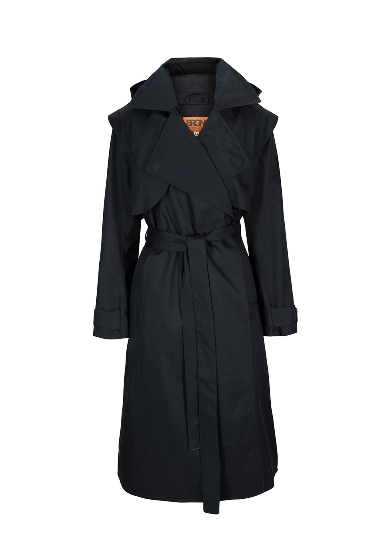 Regndråpe Trench Coat i fargen New Black, er en vanntett regnjakke laget av resirkulert tekstiler med hele 20.000 i vannsøyle.